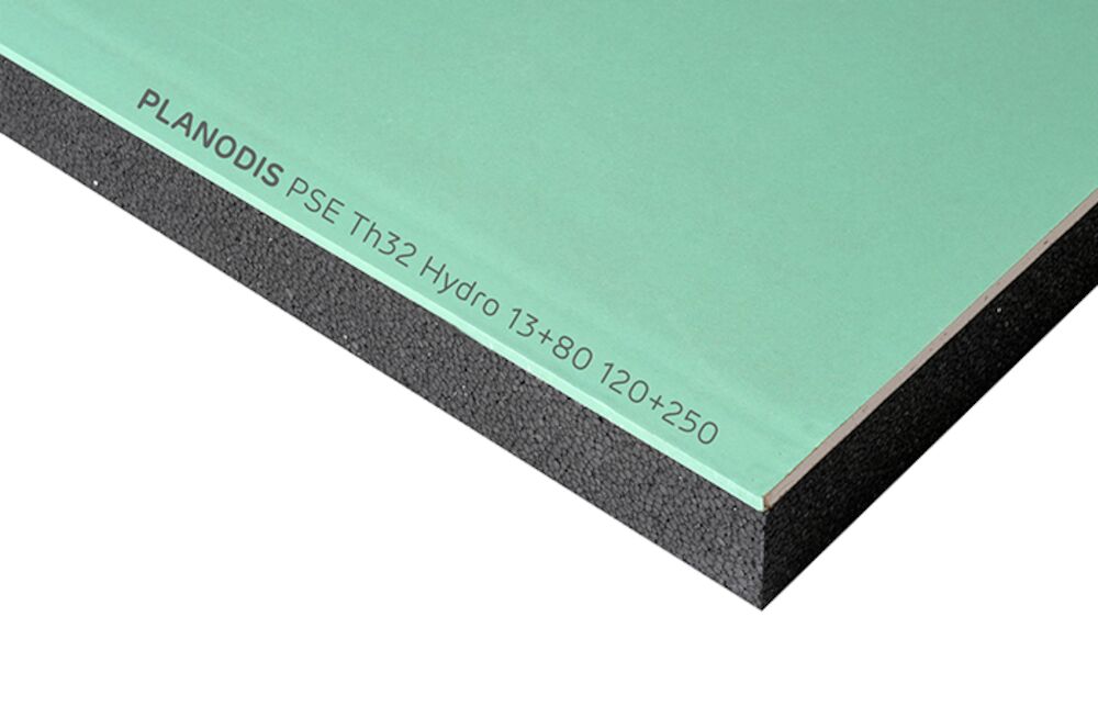 Doublage thermique haute performance constitué d'un panneau isolant en polystyrène expansé (PSE) graphité encollé sur une plaque de plâtre BA13 Hydrofuge, largeur 120cm.